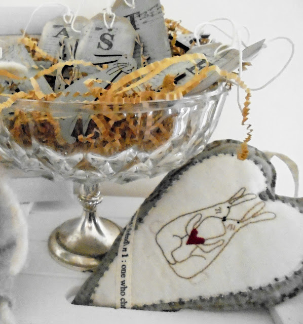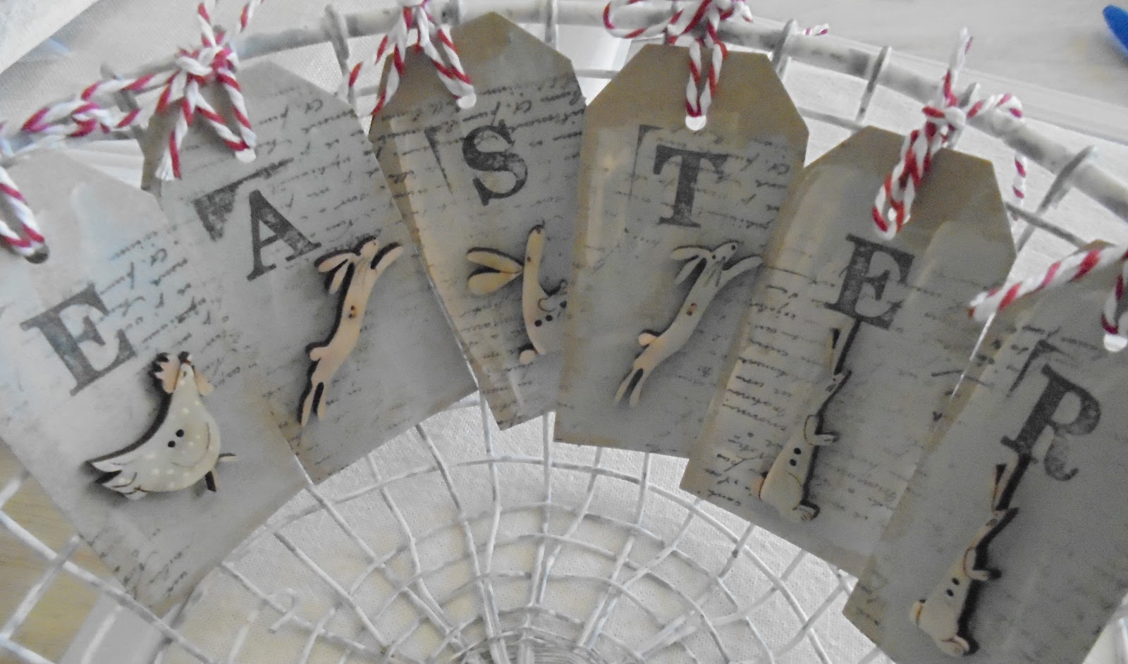 EASTER each has more a soft blue paint background on the tag...some stamping & the letteres to spell EASTER....each with a faded blue French Bunny on the tag & a white twine tie..